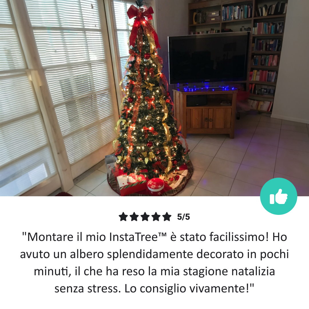 Dopo anni di alberi artificiali grandi e ingombranti, io e mio marito ne abbiamo avuto abbastanza. Abbiamo 70 anni e trasportare il pesante albero dalla soffitta è diventata una seccatura per noi. Quando ho visto questo albero di Natale ho pensato che fosse troppo bello per essere vero, ma era intrigante. L’ho mostrato a mio marito e abbiamo deciso di provarlo. È arrivato rapidamente e in perfette condizioni. Le istruzioni erano molto facili da seguire e abbiamo montato l’albero in 5 minuti. Non ricordo l’ultima volta che sono rimasta così colpita da un prodotto! È bellissimo con le sue luci scintillanti, i nastri, i fiocchi e le palline!