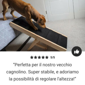 Ho un cane anziano, e questa rampa è stata una svolta! È robusta, facile da regolare e ha reso molto più facile salire sul divano per lui. La consiglio vivamente